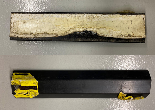 The competitive product’s adhesion failed after six months on a smooth enclosed floor of a heated garage. Note the appearance of the warped adhesive tape on the bottom and the unsightly, destroyed labels on the top. We then installed Dooger's Dead Nuts On Parking Guide in the same position where it remains today after four years of everyday wear and tear, including many floor washes.